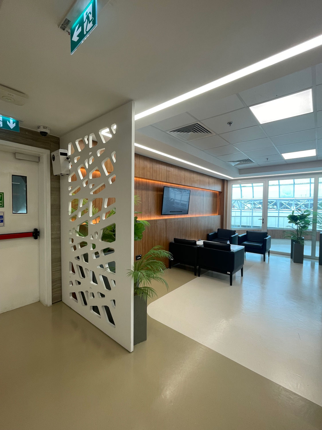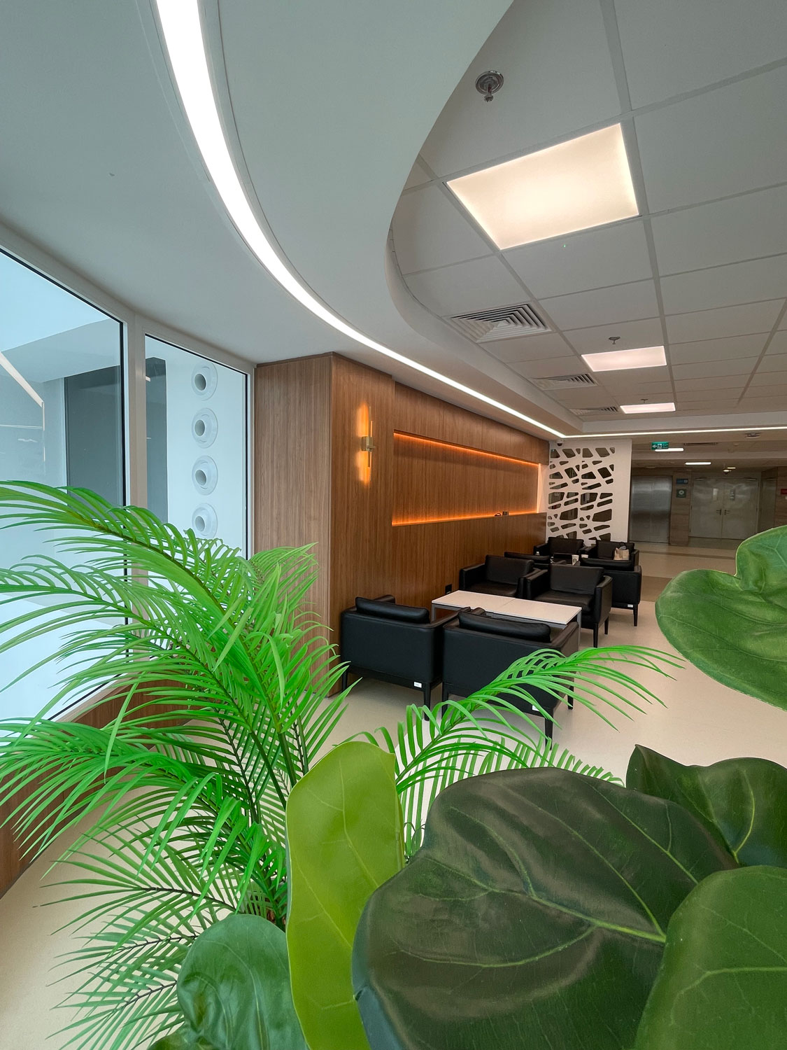 Renovation of the typical landings on the 3rd, 4th, and 5th floors aims to enhance the ambiance of waiting areas and create continuity between newly renovated units. The scope includes wood finishes, marble flooring and wall cladding, and new furniture to align with the hospital’s modern identity.